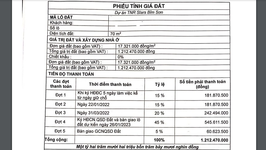 Theo UBND thị xã Bỉm Sơn, nhiều thông tin về việc giao dịch sản phẩm BĐS tại dự án TNR Star Bỉm Sơn với giá trị đất dự kiến khá cao so với đất tại thị xã ở thời điểm hiện tại làm ảnh hưởng công tác bồi thường, hỗ trợ tái định cư khi thu hồi thực hiện dự án (Ảnh: Bảng tính giá đất cho khách hàng "đặt chỗ" tại dự án TNR Stars Bỉm Sơn hơn 17 triệu đồng/m2)