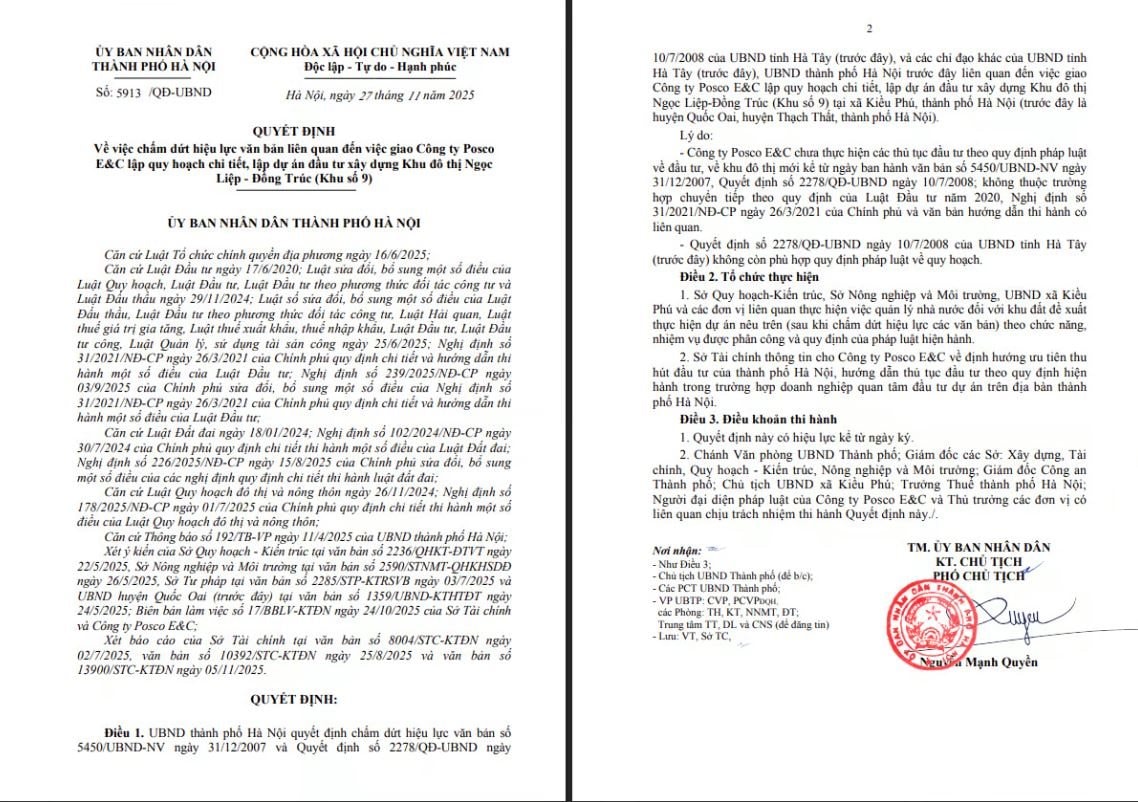 Cụ thể, Ngày 27/11/2025, UBND Thành phố Hà Nội ra quyết định chấm dứt hiệu lực toàn bộ văn bản và các chỉ đạo của UBND tỉnh Hà Tây (trước đây) liên quan việc giao Công ty Posco E&C lập quy hoạch chi tiết, lập dự án đầu tư xây dựng Khu đô thị Ngọc Liệp - Đồng Trúc (Khu số 9) tại xã Kiều Phú, thành phố Hà Nội (trước đây là huyện Quốc Oai, huyện Thạch Thất, thành phố Hà Nội).
